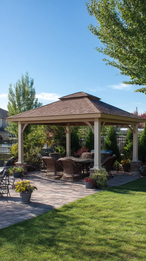 A freestanding gazebo β a four-posted structure with a fixed or soft roof β creates the most complete and most enclosed shade solution available without permanent construction. A gazebo provides overhead shade, side screening if the panels are closed, and a defined outdoor room that functions independently of the house wall in a way that awnings and wall-mounted structures cannot. For backyards where the primary entertaining area is not adjacent to the house, a gazebo is often the only practical option.