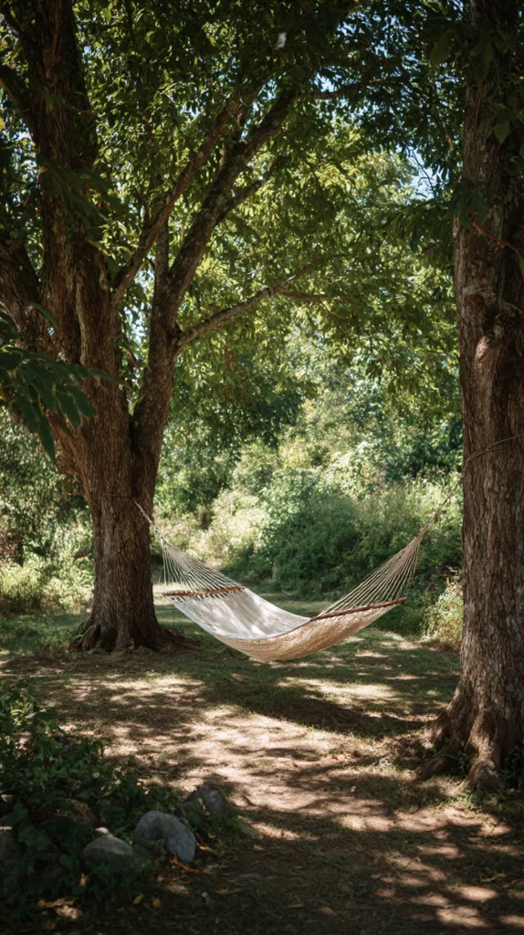 Style tip: Hang the hammock perpendicular to the sun’s path rather than parallel to it. A hammock oriented east to west means the occupant lies with their head in shade and their feet in sun as the sun moves; one oriented north to south means the shade from the trees above falls across the full length of the hammock throughout the afternoon. The orientation of the hammock within the available tree positions is the detail most people do not consider and most benefit from getting right.