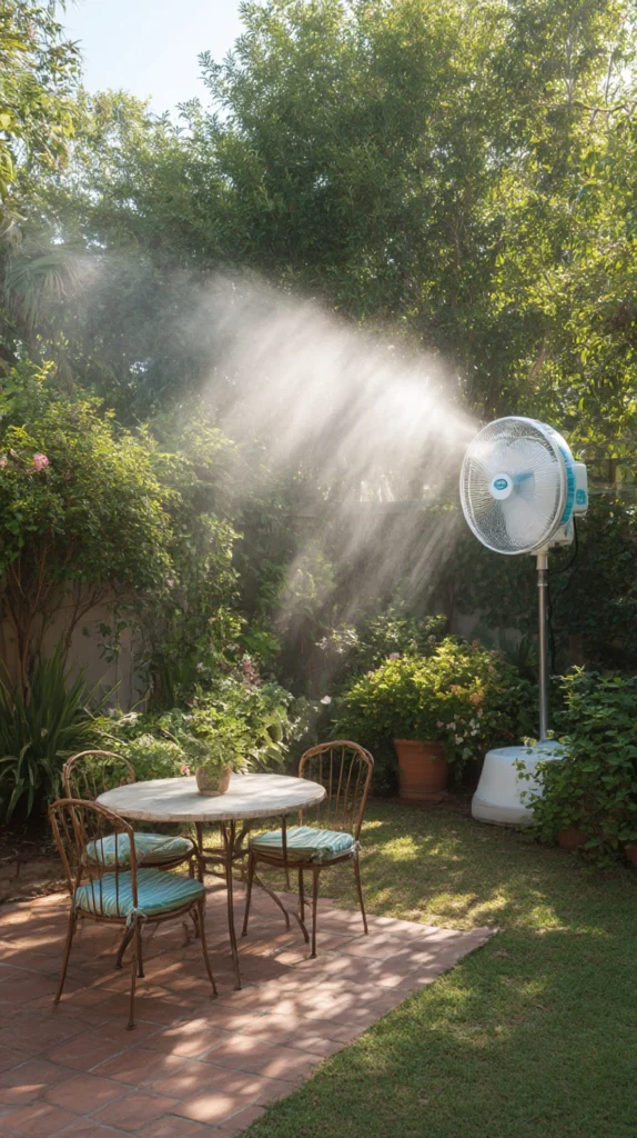 A misting fan β an outdoor fan fitted with a water misting ring that sprays a fine cool mist into the air in front of the moving blades β does not create shade but creates the cooling effect of shade in areas where shade is not possible. In an exposed garden with no trees and no suitable fixing points for structural shade, a misting fan is the most effective heat management tool available and the only solution on this list that works independently of the sun’s position or direction.