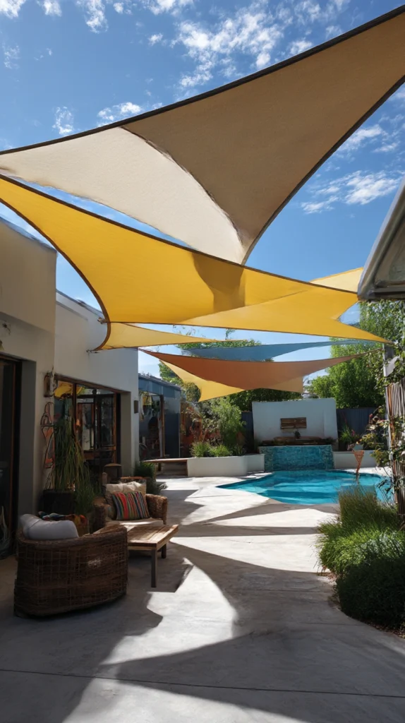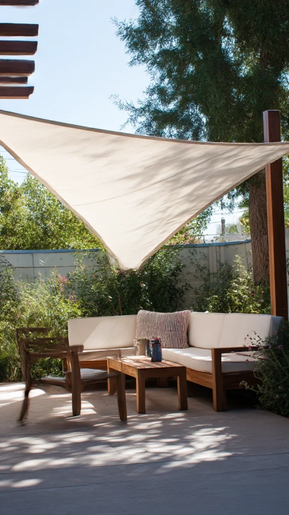A tensioned shade sail β a triangular or rectangular panel of UV-blocking fabric stretched between three or four anchor points β provides fixed shade over a defined area of the backyard without the visual bulk of a pergola or the maintenance requirements of an umbrella. Shade sails filter rather than block the sun, which means the space beneath them remains bright and pleasant while the direct heat of the sun is significantly reduced.