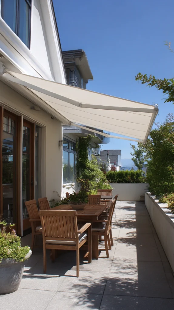 A retractable awning fixed to the house wall above a patio door or window provides on-demand shade that can be extended on hot days and retracted when the sun is not a problem, when the space is not in use, or when wind makes an extended canopy unsafe. It is the most controllable shade solution on this list β shade precisely where and when it is needed, absent when it is not.