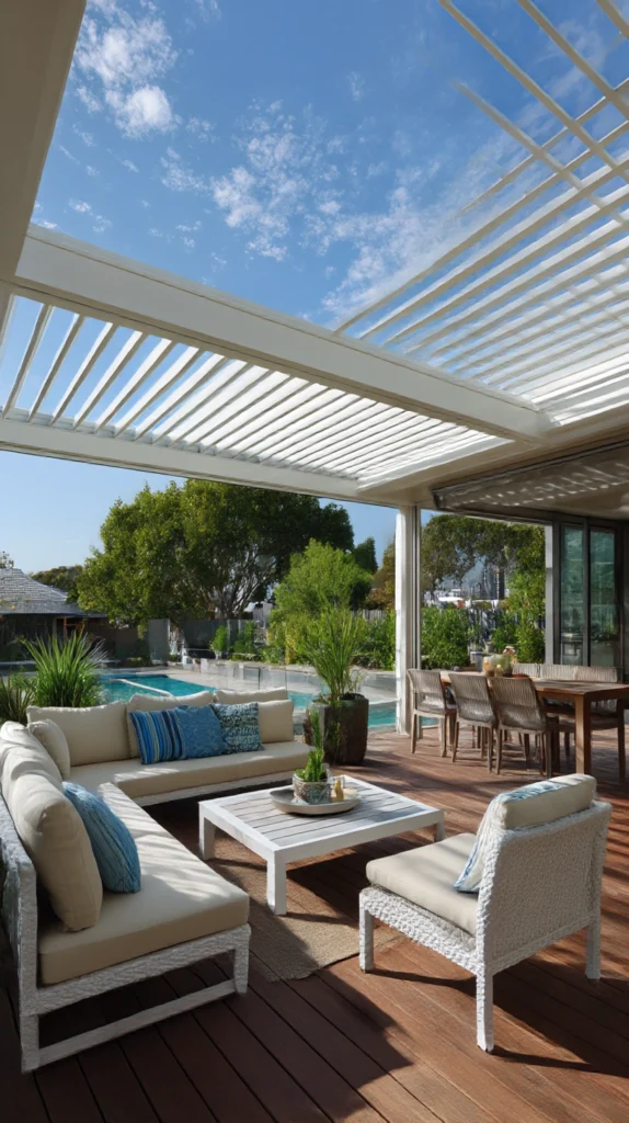 A louvred aluminium roof β a pergola frame fitted with horizontal aluminium slats that rotate from fully open to fully closed β provides the most controllable and most weather-resistant shade solution available to a backyard. Open louvres allow full sun and air movement; partially open louvres provide filtered shade; fully closed louvres shed rain and provide complete overhead cover. The system works in every weather condition and requires no action other than adjusting the louvre angle.