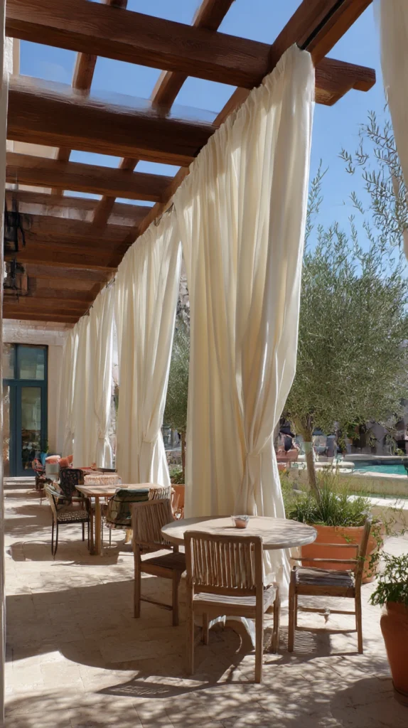 Heavyweight outdoor curtain panels hung from a rod or wire along the sun-facing side of a pergola or patio structure β drawn across the afternoon sun and tied back when not needed β create a shade wall of fabric that is softer, more moveable, and more atmospheric than any rigid screen. Outdoor curtains in a warm linen tone filter the light that passes through them into something golden and gentle rather than blocking it entirely.