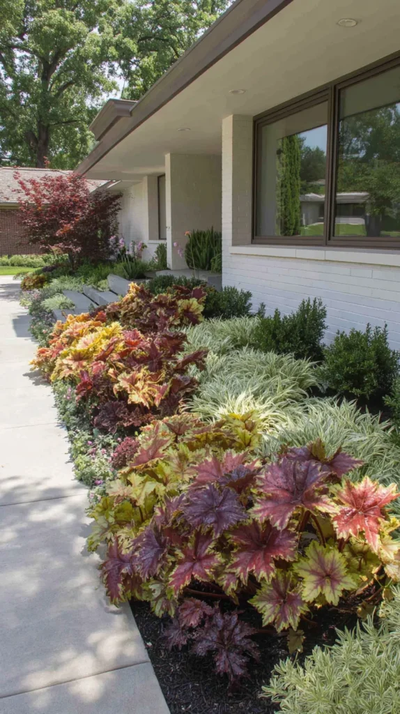 Their fibrous, evergreen rosettes establish well in clay, particularly in partial shade, and the tall, airy flower spikes in summer attract pollinators. Varieties like ‘Palace Purple’, ‘Caramel’, and ‘Obsidian’ are especially popular and widely available.