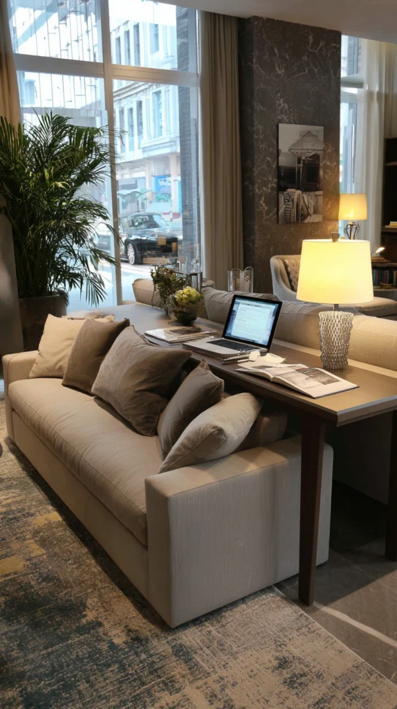 Placing a slim, long desk directly behind your sofa is a classic “pro designer” move. This layout utilizes the “dead space” that often exists between a sofa and the rest of the room. It acts as a sophisticated room divider, creating a physical boundary without the need for a wall.