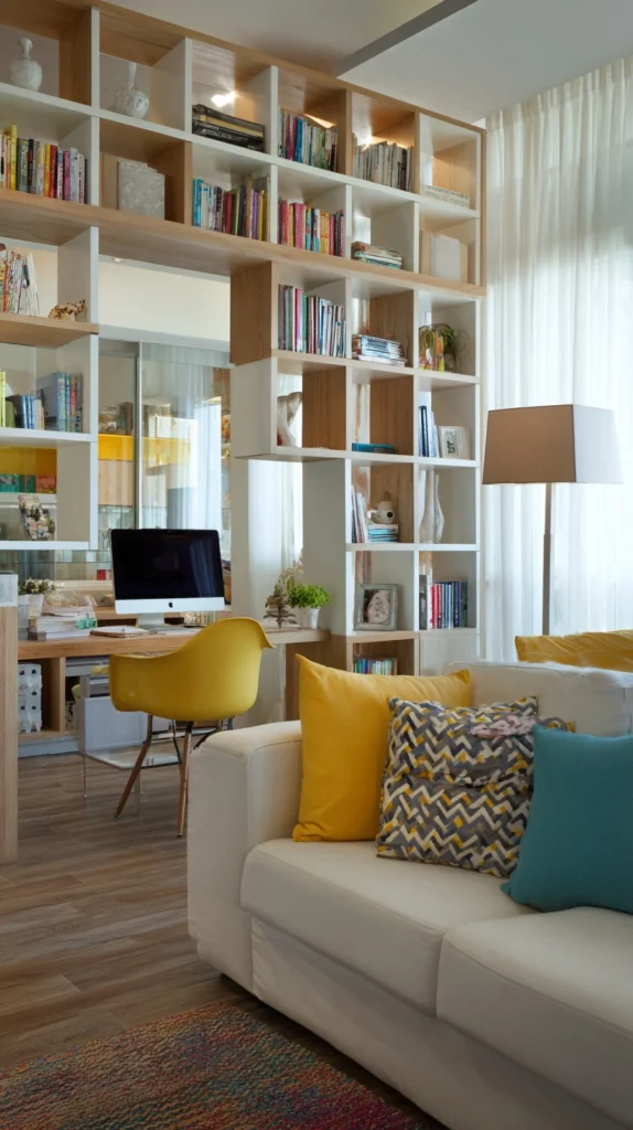 In a large, open-concept living room, it can be hard to focus. Use a large, open-back bookshelf (like an Ikea Kallax or a metal etagere) to create a “wall” between your sofa and your desk.