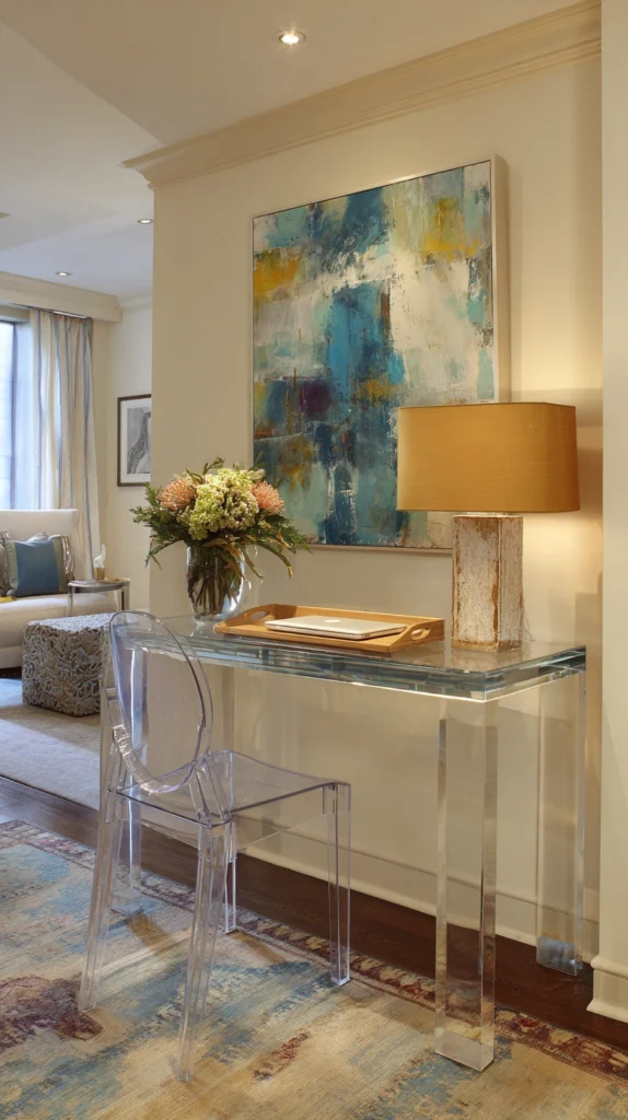 Style Tip: Pair the console with a “Ghost Chair” (clear acrylic). Because the chair is transparent, it doesn’t take up any visual space, keeping the living room looking airy and uncluttered.