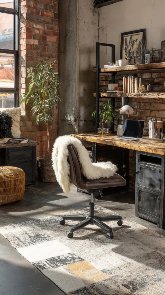 Functional Upgrade: Industrial desks often have large surfaces. Use this to your advantage by setting up a dual-monitor system. To keep the “loft” look clean, use black cable sleeves that match the iron legs of the desk, making the wires look like part of the furniture’s design.