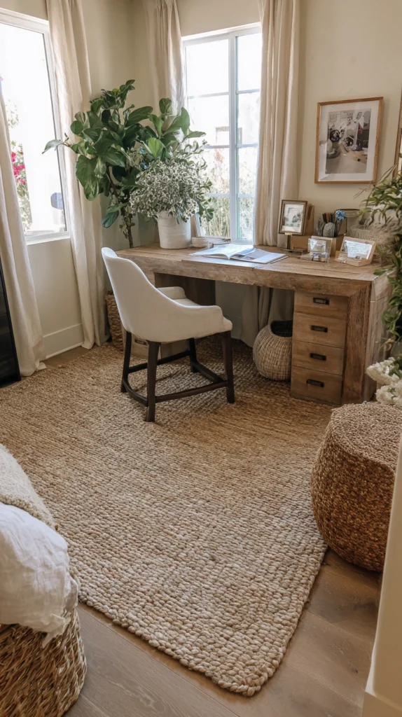 Style Tip: Try layering. Place a large, neutral jute rug over the entire living room, and then place a smaller, colorful Persian or geometric rug specifically under the desk and chair. This creates a “nest” for your work.