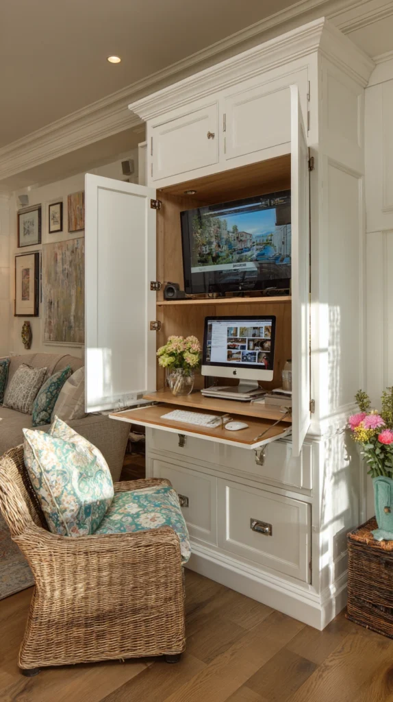 Functional Upgrade: Most armoires have a pull-out keyboard tray. Ensure yours is at the right height to prevent wrist strain. If the armoire doesn’t have built-in cord management, use a hole-saw bit to create an opening in the back for your power strip, allowing you to keep everything plugged in while the doors are shut.