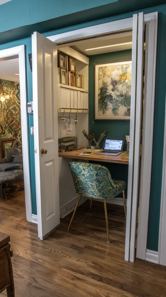 The “cloffice” trend has exploded because it offers the one thing most open-plan living rooms lack: the ability to “shut the door” on work. By removing closet doors and inserting a desktop, you create a recessed workstation that feels like its own private room.