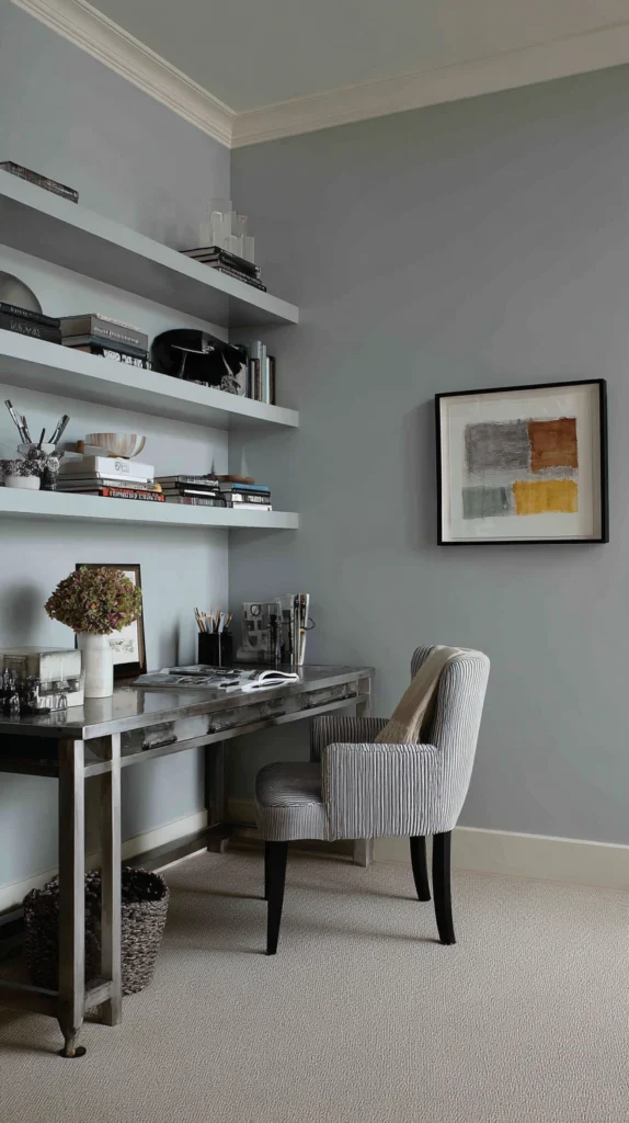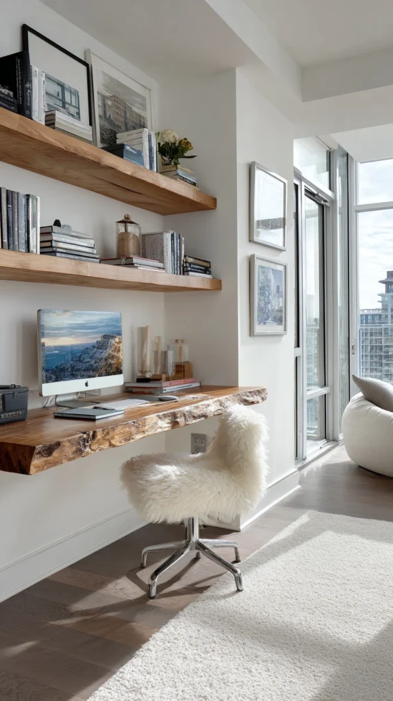 Style Tip: Create a “wall of productivity” by mounting three or four floating shelves above the desk at varying heights. Use the top shelves for decor—think ceramic vases or art—and the lower shelves for functional items like notebooks and reference books.