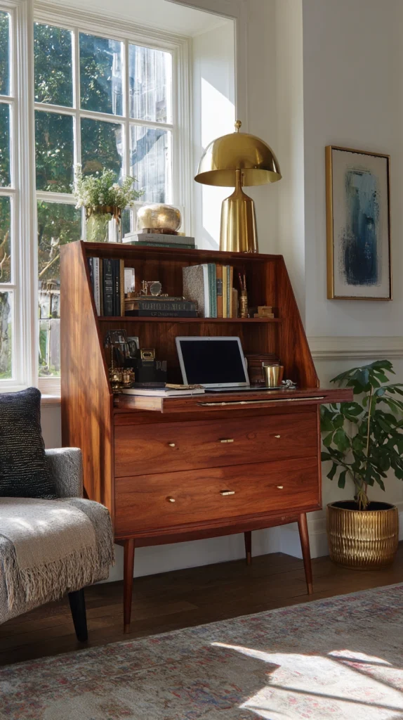 Style Tip: Look for a piece in warm teak or walnut with tapered legs. When the desk is closed, it looks like a high-end bar cabinet or an antique chest. Top it with a vintage brass lamp to lean into the “old world” charm.