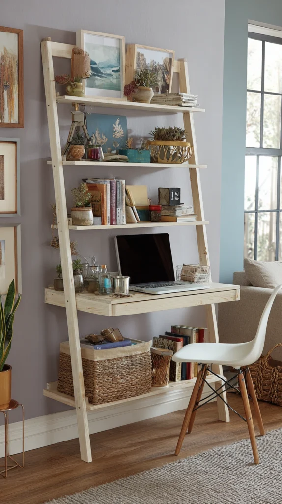 Ladder desks lean against the wall and gradually get deeper toward the bottom. They are incredibly popular for Pinterest-style homes because they look more like a bookshelf than a piece of office furniture.