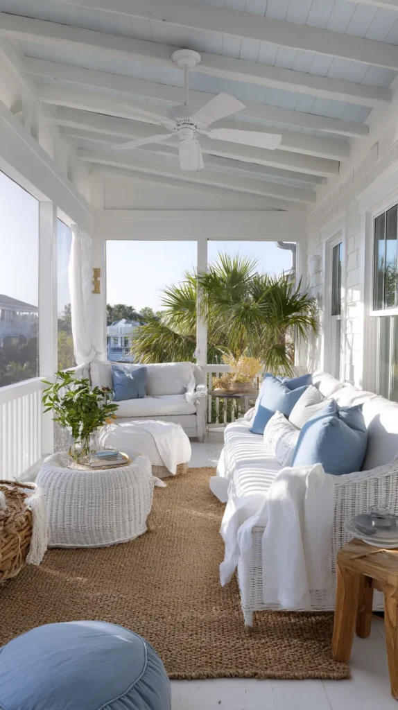 Incorporate pops of coastal blue through throw pillows, pottery, or artwork depicting ocean scenes that reinforce the seaside aesthetic. Install ceiling fans painted white with natural fiber or light wood blades that provide cooling circulation while maintaining the fresh, airy feeling.