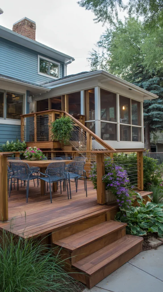 Add stairs connecting the levels with built-in planters or seating along the transition, making the change in elevation feel intentional and designed. Furnish each area appropriately—protected furniture and textiles in the screened section, more weather-resistant options on the open deck.
