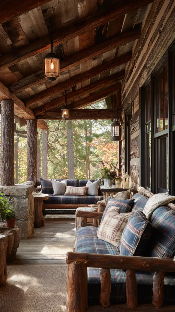 Create a mountain retreat ambiance with natural wood walls and ceiling, log furniture or twig chairs, and plaid or nature-inspired textiles in forest greens and warm browns. Install a wood-burning stove or stone fireplace if permitted, adding authentic cabin warmth and extending the porch’s usability into cool weather.