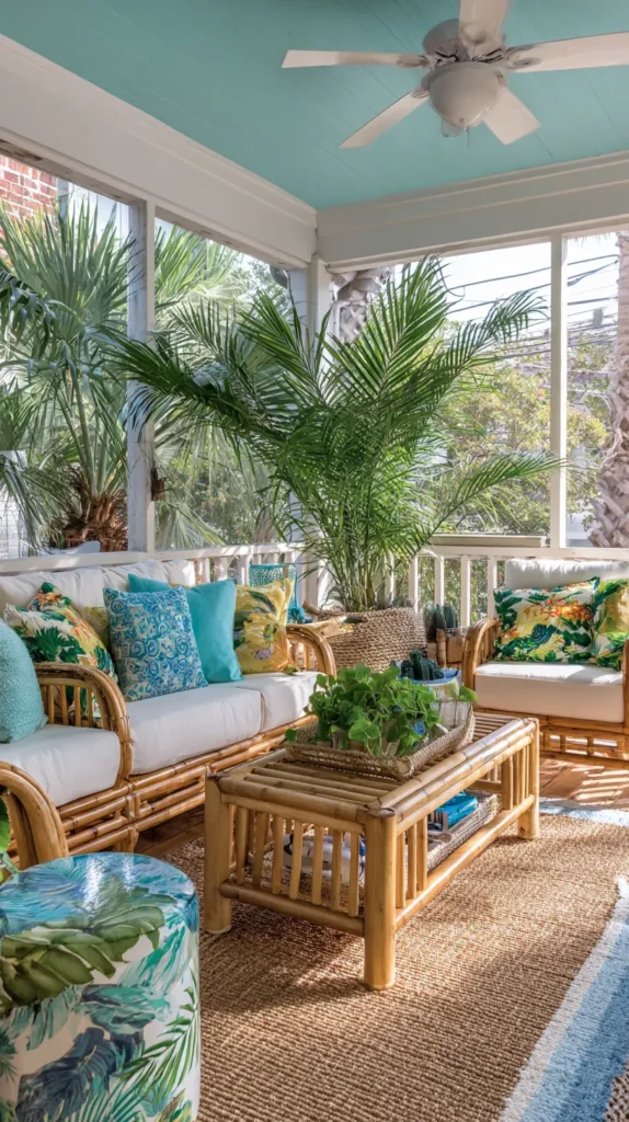Transform your screen porch into a lush tropical escape with bamboo furniture, bright tropical-print fabrics, and an abundance of tropical plants creating island resort vibes. Paint the ceiling in vibrant turquoise or install bamboo ceiling panels for authentic tropical material that sets the tone immediately upon entry.