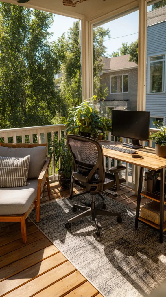 Design a screen porch that functions as an inspiring home office during work hours and relaxation space during evenings and weekends. Install a substantial desk positioned to face the best view, with proper electrical outlets and internet connectivity supporting computer equipment and charging needs.