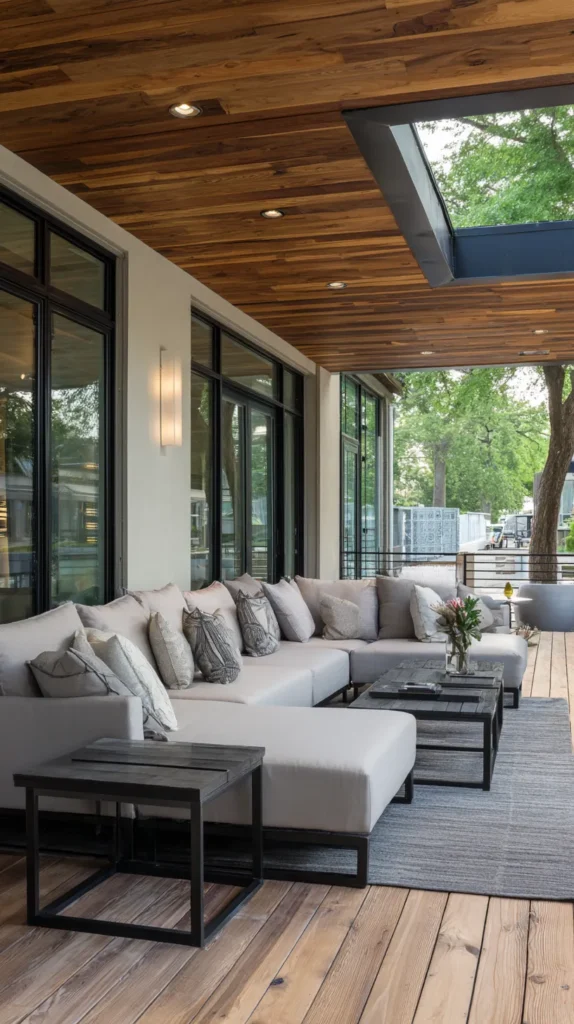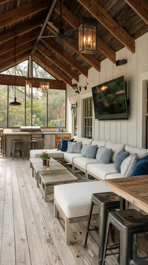 Add a large sectional or multiple seating groups accommodating crowds, with movable ottomans and poufs providing flexible additional seating. Include a television, sound system, and multiple lighting options controlled by dimmers, allowing the space to adapt from daytime barbecues to evening movie nights seamlessly.