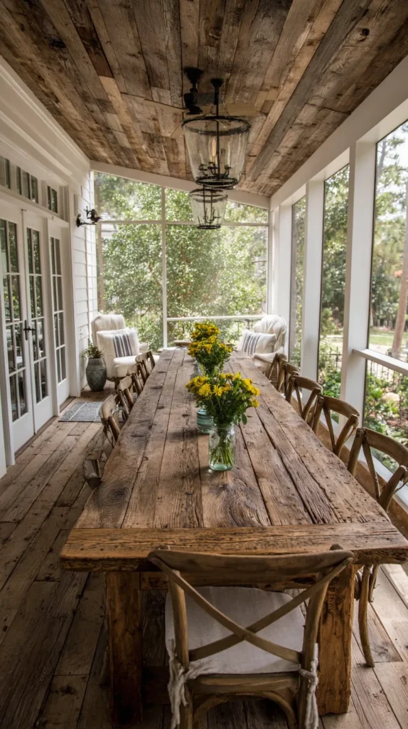 Transform your screen porch into an outdoor dining room with a large farmhouse table, mismatched chairs, and rustic wooden chandelier creating a gathered, lived-in look. Add shiplap or beadboard ceiling for architectural texture and character that reinforces the farmhouse aesthetic while providing visual interest overhead.