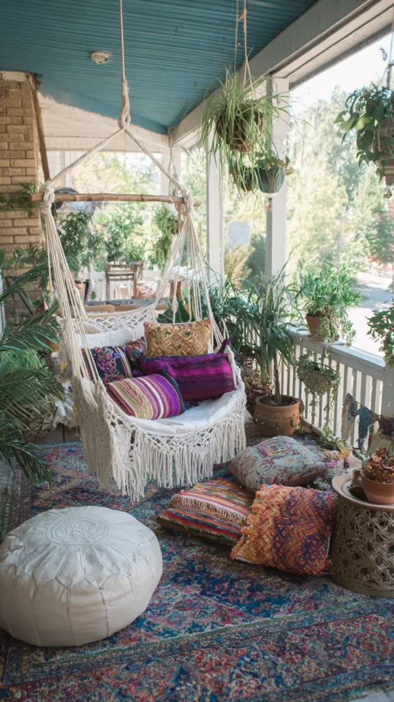 Create an eclectic, collected-over-time feel with layered textiles, mixed patterns, globally-inspired accessories, and abundant plants creating bohemian richness and personality. Hang a macramé hammock chair or swing in one corner, add floor cushions and poufs for flexible seating, and layer multiple outdoor rugs in complementary patterns.