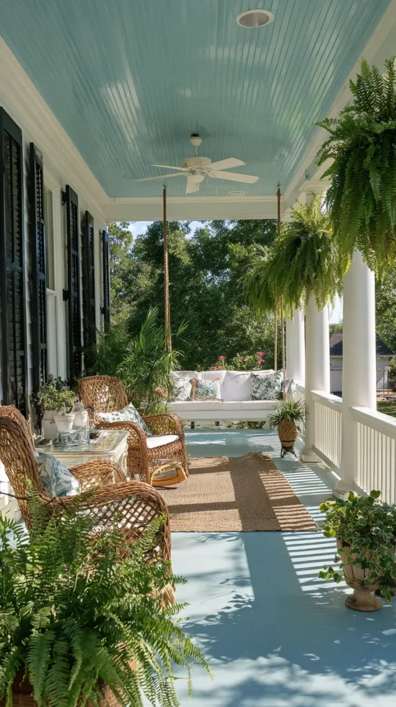 Honor classic Southern architecture with a screen porch featuring painted tongue-and-groove ceiling in soft blue or green, white columns, and traditional proportions creating timeless elegance. Furnished with a porch swing suspended from the ceiling, classic wicker rockers, and a ceiling fan with traditional blade design for authentic period appeal.