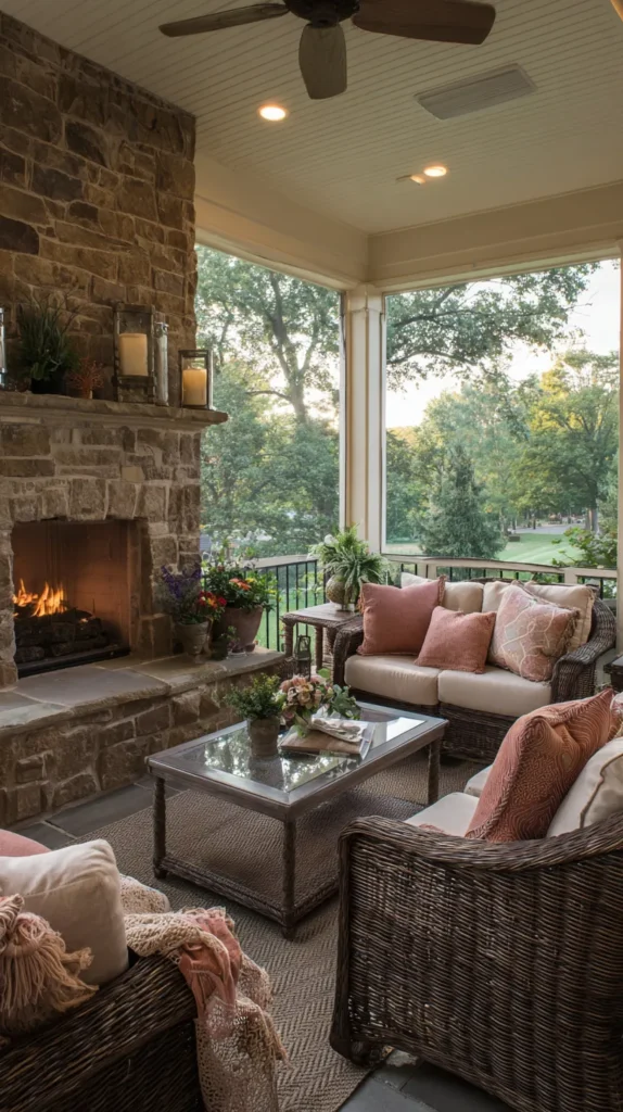 Design a screen porch with removable or convertible panels that transform the space from screened summer room to enclosed winter retreat accommodating year-round use. Install a fireplace or outdoor heater that extends usability into cooler months, creating a cozy gathering spot even when temperatures drop significantly.