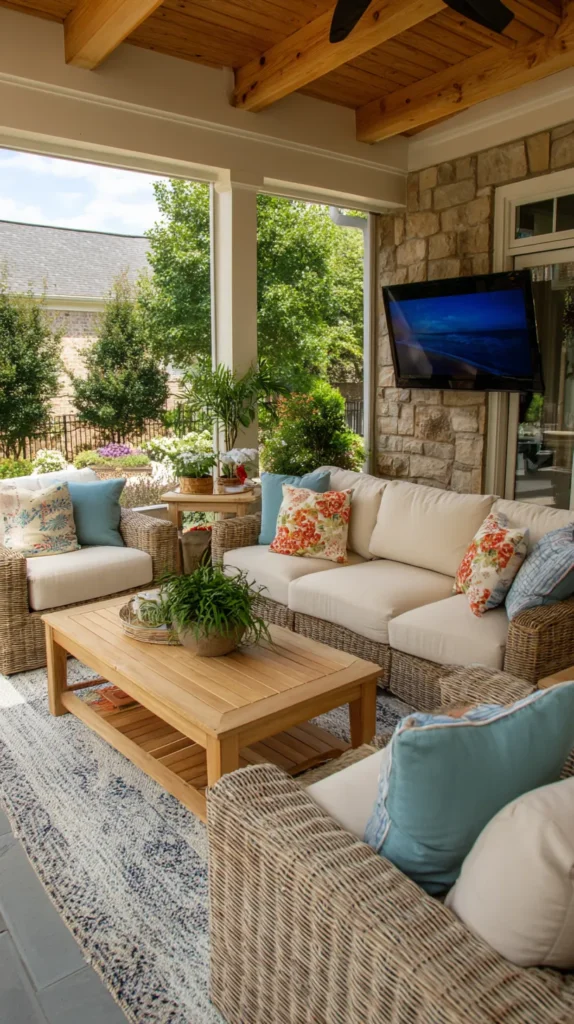 Create seamless flow between interior and screen porch by extending your living room’s color palette, furniture style, and design aesthetic into the outdoor space. Use weather-resistant versions of indoor fabrics in matching or complementary colors, maintaining visual continuity that makes the porch feel like a natural extension.