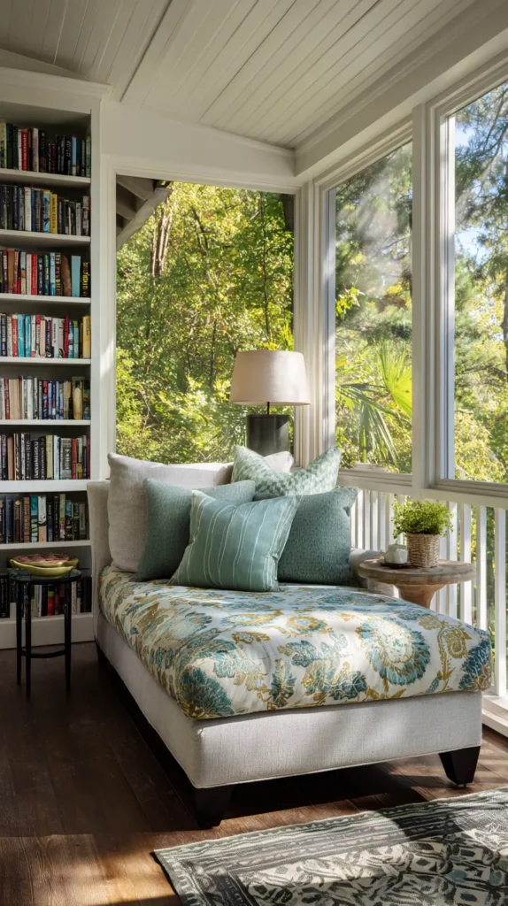 Dedicate the screen porch to quiet relaxation with a comfortable daybed or chaise lounge piled with pillows, positioned to capture the best natural light and views. Add built-in bookshelves or a small bookcase stocked with current reads, magazines, and beloved favorites within arm’s reach of the seating.
