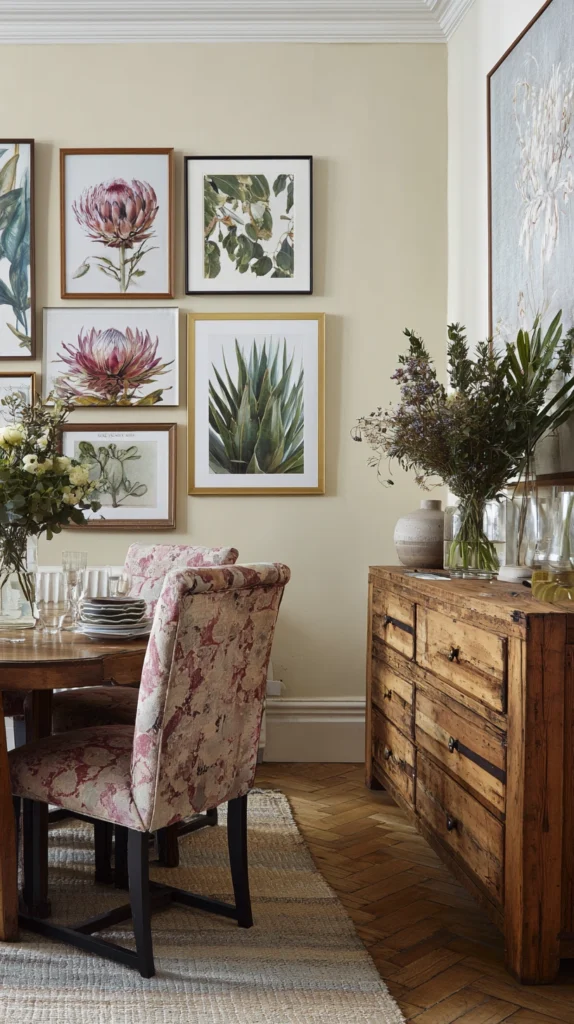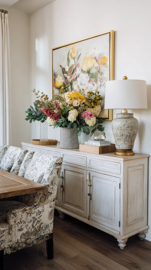 A gallery wall of framed artwork, a single large statement painting above the sideboard, or a collection of wall-mounted ceramics and botanical prints all create a dining room of genuine visual richness without consuming any of the limited floor space. Choose art and display objects in a cohesive color palette that reinforces the room’s overall decorating scheme.