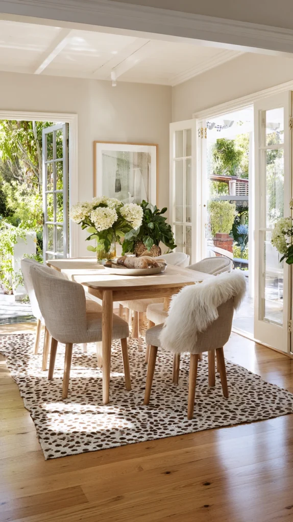 A continuous floor of light timber, pale stone, or a large-format light-colored tile creates the most expansive and most visually unified floor surface for a small dining room. If a rug is used beneath the dining table, choose one in a tone close to the floor color so that it defines the dining zone without creating a strong color contrast that visually reduces the apparent size of the floor.
