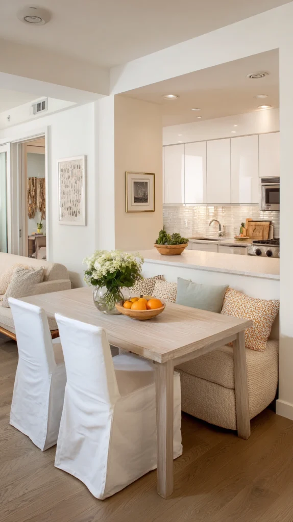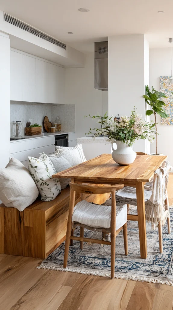 Replacing two chairs on one side of a small dining table with a bench seat creates additional seating capacity without requiring additional floor space for chair legs and chair backs to extend into. A bench can seat three people in the space that two chairs would typically occupy, and when pushed beneath the table it disappears almost entirely from the floor plan of the room.