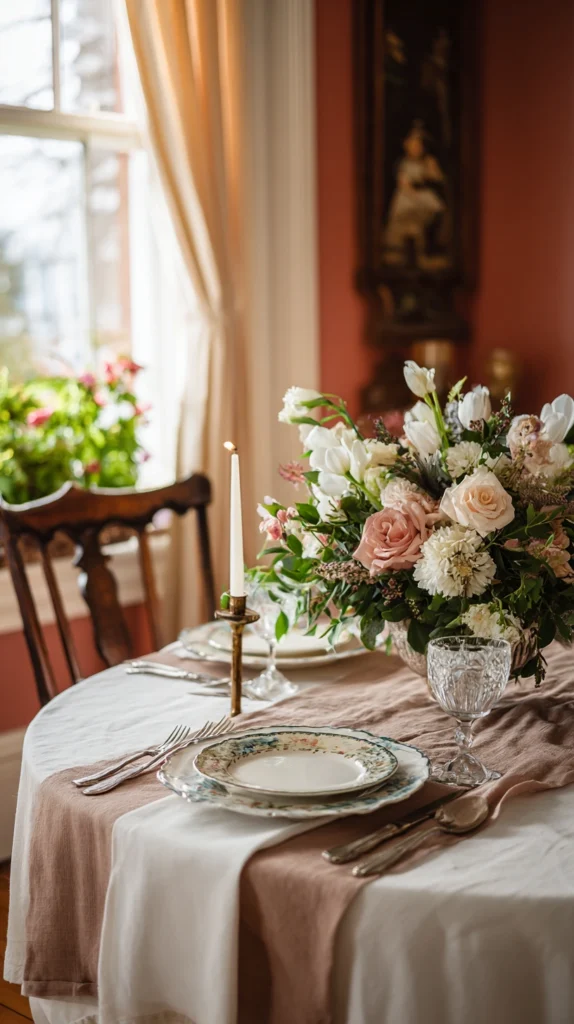 A small dining room table that is beautifully dressed for meals. a simple linen runner, a small vase of fresh flowers, cloth napkins, and a single candle. creates an atmosphere of genuine occasion and care that makes every meal in the room feel more special and more considered than a bare table would allow.
