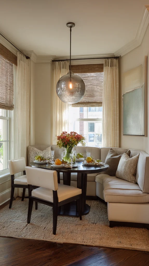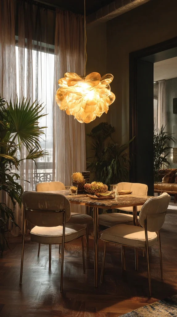 A well-chosen pendant light hung above the dining table creates a focal point of genuine visual authority that immediately makes the small dining room feel deliberately designed rather than simply furnished. The pendant light defines the dining zone within the room, creates an intimate pool of warm light above the table during mealtimes, and contributes a decorative dimension that no other single element in the room can quite replicate.