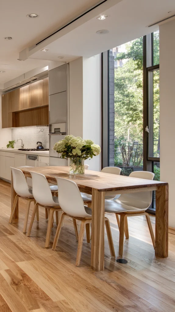 Slim-profile chairs that tuck fully beneath the table surface remove themselves almost entirely from the room’s footprint when not in use, freeing the floor space around the table for circulation and creating the impression of a less crowded room between mealtimes.