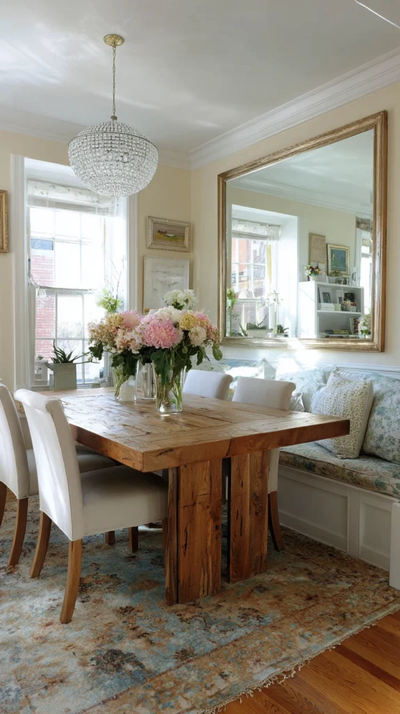 A large framed mirror positioned on the wall opposite the window creates the most dramatic light-amplifying effect and the most convincing spatial expansion in a small dining room.