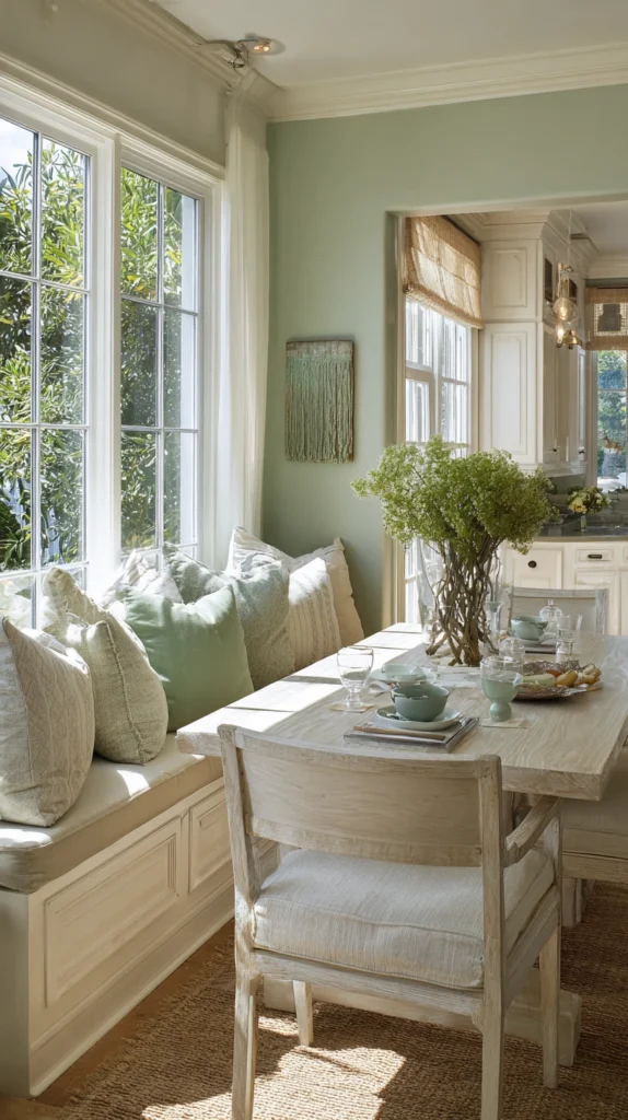 Warm whites, soft creams, pale greiges, and gentle sage greens all work beautifully as the primary tone of a small dining room. Introduce color through smaller elements. The chair upholstery, the tableware, the artwork. rather than through large surfaces that divide and visually shrink the room.