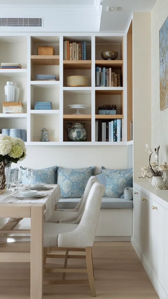 A small dining room that incorporates built-in storage within its walls. bookshelves flanking the window, a low sideboard built into the wall at one end of the room, or a floor-to-ceiling cupboard that provides concealed storage for dining accessories, makes the room more functional, more organized, and visually calmer than a room where separate storage pieces compete for the limited floor space with the dining furniture.