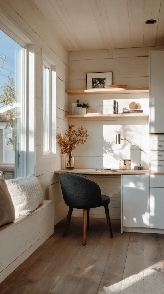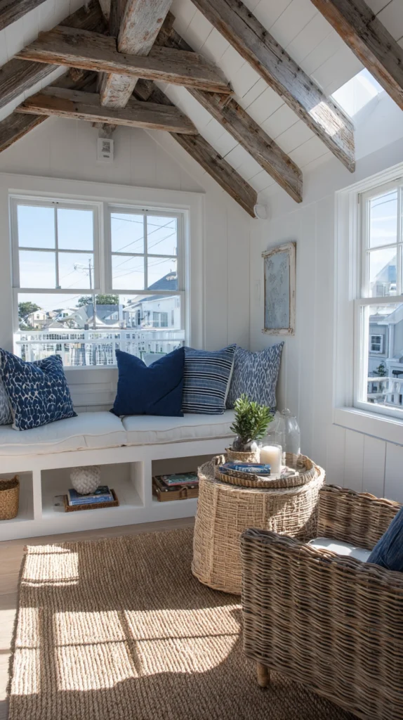 To maximize the small space, use nautical-style built-ins that mimic a ship’s cabin. Decorative touches like glass fishing floats or a bowl of sea glass provide a sense of calm that is perfect for meditation or light correspondence.