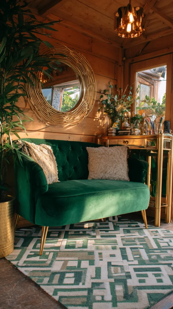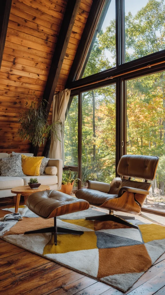 Use a geometric rug and a “pop” of mustard yellow or burnt orange to give the room character. This style is particularly effective in sheds with large “picture” windows, as it emphasizes the connection between architecture and nature.