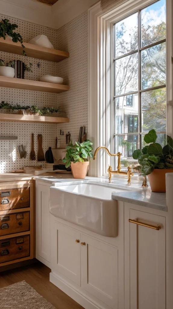 For the serious gardener, the interior should be as functional as it is beautiful. A zinc-topped potting bench provides a durable work surface, while a deep farmhouse sink adds utility. To elevate the look, use high-end hardware—brass faucets and hand-forged hooks. Store your seeds in an antique library card catalog and keep your tools organized on a custom pegboard painted in a sophisticated charcoal or navy.