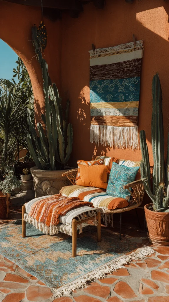 Embrace the warmth of the desert with terracotta tiles and a palette of ochre, clay, and turquoise. Use a large woven tapestry as a wall focal point to add texture without taking up floor space.