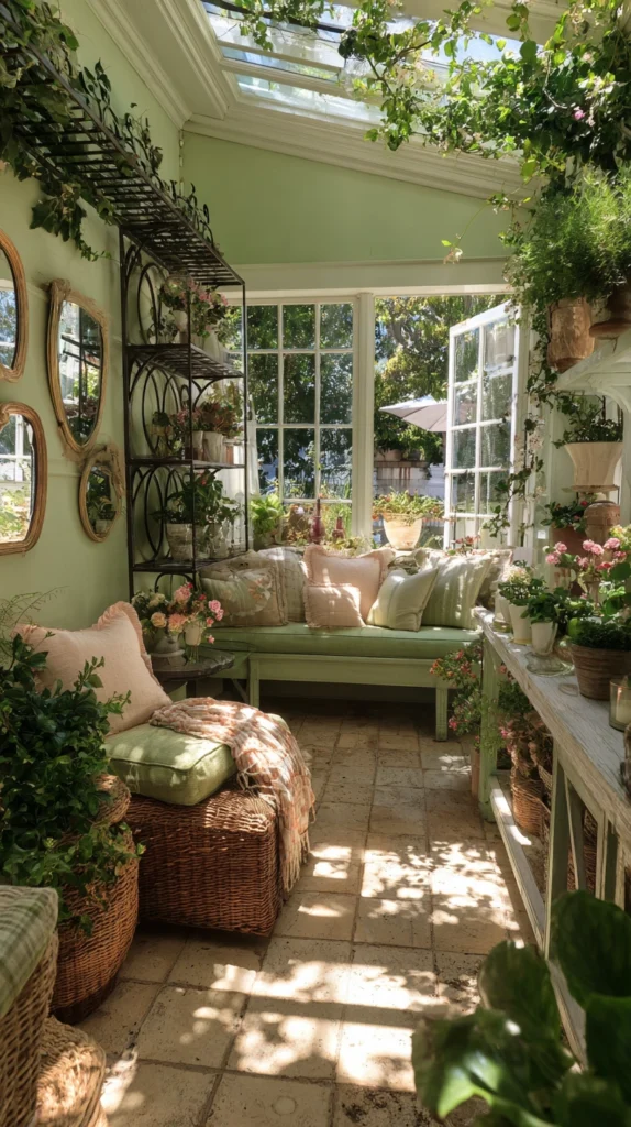 Bring the outdoors in by mimicking the aesthetic of a classic greenhouse. This interior style relies heavily on glass—if your shed doesn’t have large windows, use mirrors to simulate them. Incorporate wrought iron shelving units filled with terra cotta pots, trailing ivy, and ferns. Use a soft sage green or pale primrose yellow on the walls to bridge the gap between your interior sanctuary and the blooming garden just outside the door.