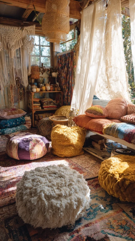 For the soul that thrives on color and texture, the Boho Atelier is the ultimate creative hub. Layered Moroccan rugs cover the floor, providing warmth and sound dampening. Instead of traditional chairs, opt for oversized floor poufs and a low-profile daybed.
