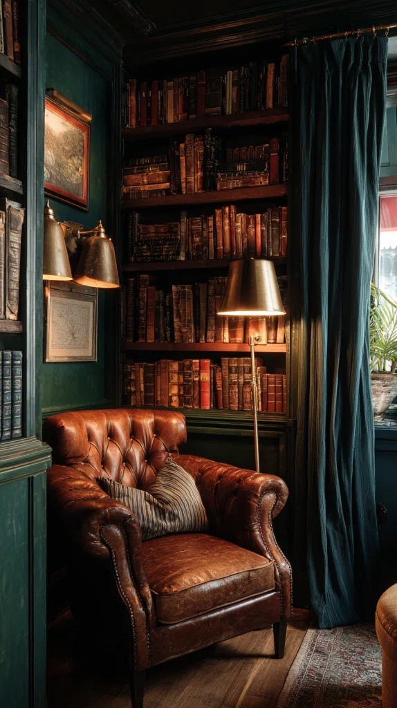 Small spaces handle dark colors surprisingly well, creating a “jewel box” effect. Paint the walls a deep forest green, navy, or even a soft black. Floor-to-ceiling bookshelves (even if they are shallow) create a sense of verticality.