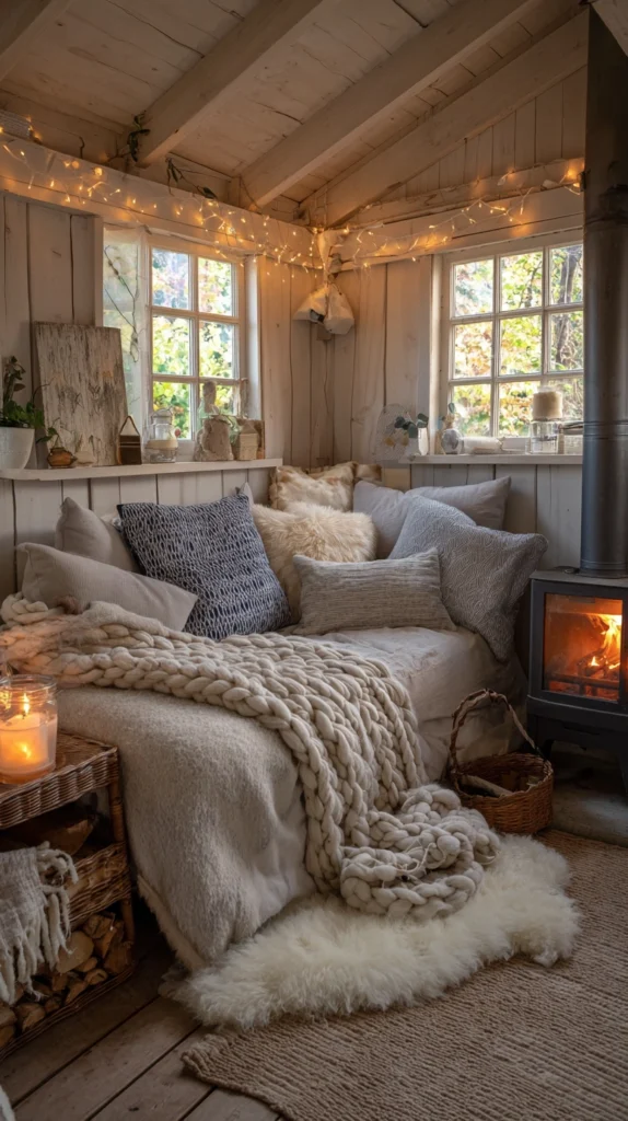 Use a neutral palette of creams and light grays, accented by chunky knit throws and sheepskin rugs. A small corner wood-burning stove (or a realistic electric version) serves as the heart of the room, making it a year-round escape.