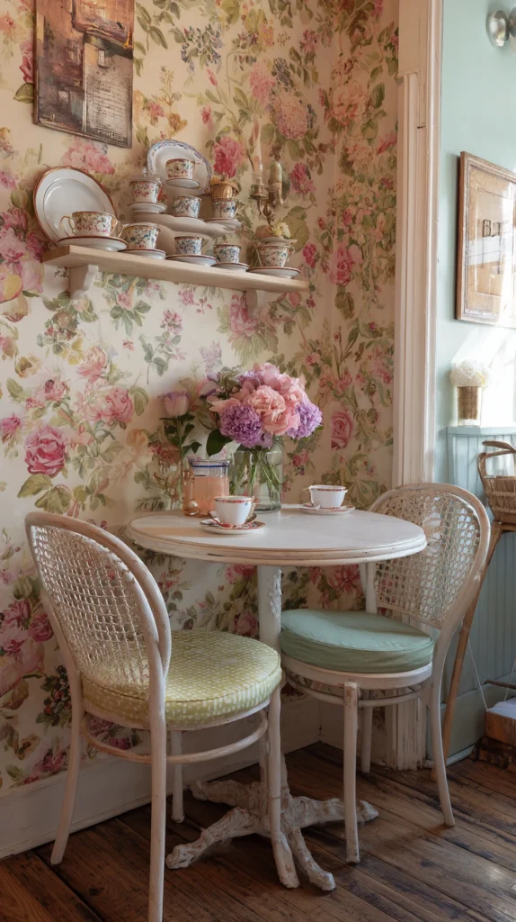 Transform your shed into a nostalgic escape inspired by mid-century tea parlors. Use floral wallpaper on a single accent wall to provide depth without making the room feel “busy.” A petite bistro table with two wire-backed chairs creates a charming spot for afternoon tea or journaling. Display a collection of mismatched antique teacups on a shallow plate rail to save counter space while adding a touch of whimsical history.