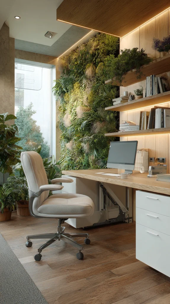 To prevent the space from feeling too “corporate,” introduce life with a vertical succulent wall and use a plush, stylish office chair that feels more like a piece of living room furniture than a piece of equipment.