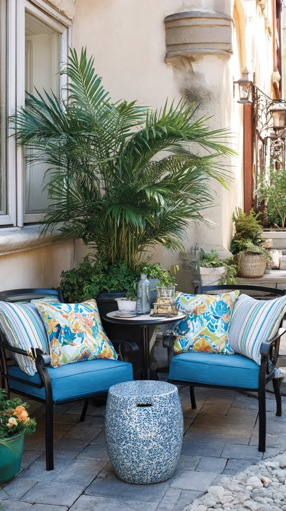 Create an intimate seating arrangement in one corner of your patio using a small L-shaped sectional or two chairs angled toward each other with a compact side table between them. Add plush outdoor cushions in weather-resistant fabrics and colorful throw pillows that invite lounging and create a cozy atmosphere for morning coffee or evening conversations.